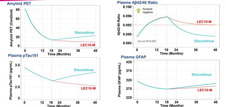 基于以上数据,仑卡奈单抗治疗早期AD的长期疗效与安全性已得到确证。而PK/PD模型显示,在18或24个月时开始维持给药方案(每月一次,10mg/kg)对CDR-SB和Aβ-PET的影响与持续4年治疗给药方案(每两周一次,10mg/kg)用药相似(图1),每月一次(10mg/kg)维持给药可防止脑内Aβ及多个血浆生物标志物的重新积聚(图2),这也成为本次其维持给药方案获批的重要原因。